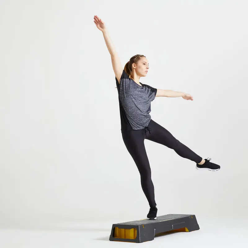 Compra en Decathlon Camiseta fitness manga corta Mujer Domyos 120 Camiseta de manga corta con corte amplio y cordón de ajuste en la cintura para ajustarla como más te guste. Tejido ligero, vaporoso y extensible.