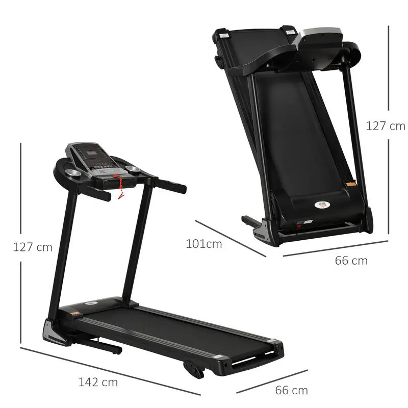 Compra en Decathlon Cinta de correr y andar plegable 12,8 km/h HOMCOM 142x66x127 cm negro Esta cinta de correr eléctrica de HOMCOM dispone de una pantalla LED para poder controlar parámetros como la velocidad, el tiempo, las calorías, la distancia recorrida y la frecuencia cardíaca.